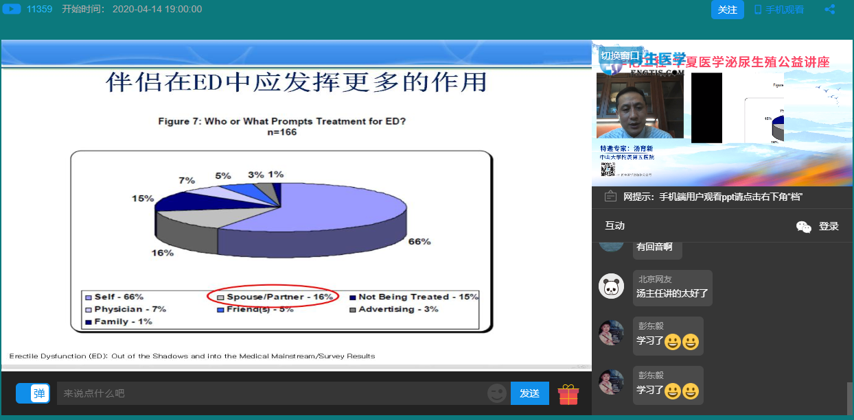 由中国医促会泌尿生殖分会主办,北京中科京附国际男科医学研究院、再生医学网作为技术支持单位的“华佗工程-华夏医学泌尿生殖公益讲座”第二季第一讲于2020年4月14日(周二)19:30-20:30开播,我们特别邀请到中山大学附属第五医院男性专科汤育新教授,为广大网民讲授了《夫妻和谐,共防ED ——致ED丈夫的女人》课程。