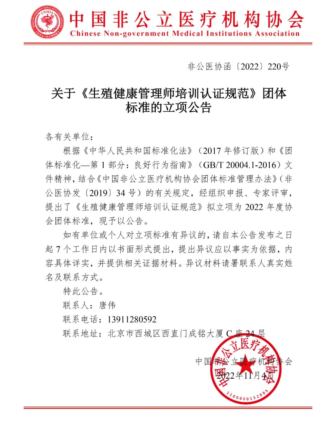 根据《中华人民共和国标准化法》(2017年修订版)和《团体标准化—第1部分:良好行为指南》(GB/T 20004.1-2016)文件精神,结合《中国非公立医疗机构协会团体标准管理办法》(非公医协发〔2019〕34号)的有关规定,经组织申报、专家评审,提出了《生殖健康管理师培训认证规范》拟立项为2022年度协会团体标准,现予以公告。